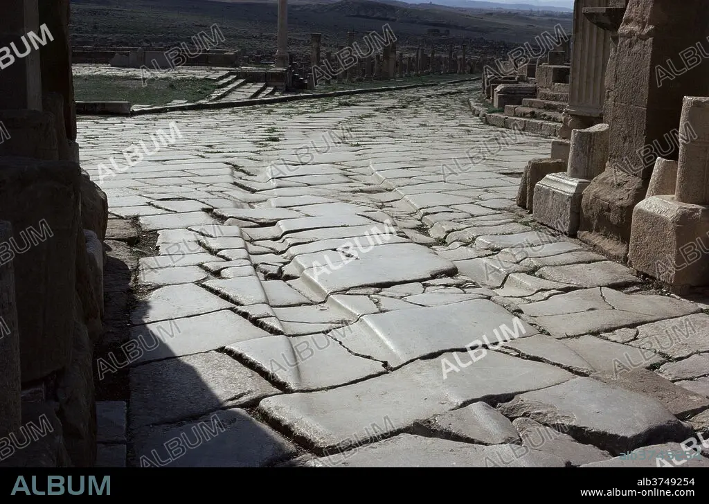 Caption: Chariot wheel ruts by the West Gate, Roman site of Timgad, UNESCO World Heritage Site, Algeria, North Africa, Africa