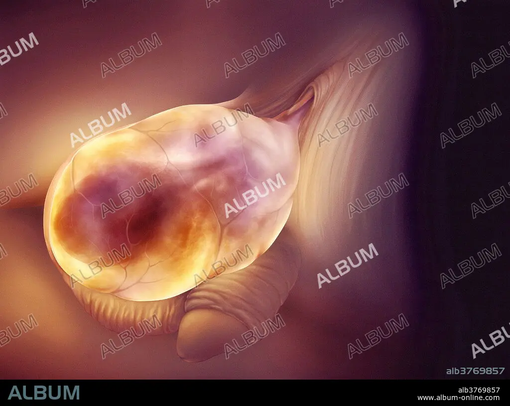 Caption: Swollen scrotum. Artwork of an enlarged, swollen scrotum. This is a hydrocele, an accumulation of fluid in the sac surrounding the testes. A hydrocele may be triggered by inflammation, infection or injury to the testes. The condition is generally painless, but if the swelling becomes too large, uncomfortable or painful, it is treated surgically by draining the fluid.