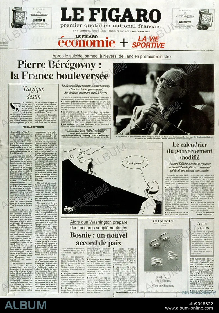 Caption: Front page of the French newspaper 'Le Figaro' after the suicide of Pierre Beregovoy, May 1993. Pierre Eugene Beregovoy (1925 1 May 1993) was a French politician who served as Prime Minister of France under President Francois Mitterrand from 2 April 1992 to 29 March 1993.