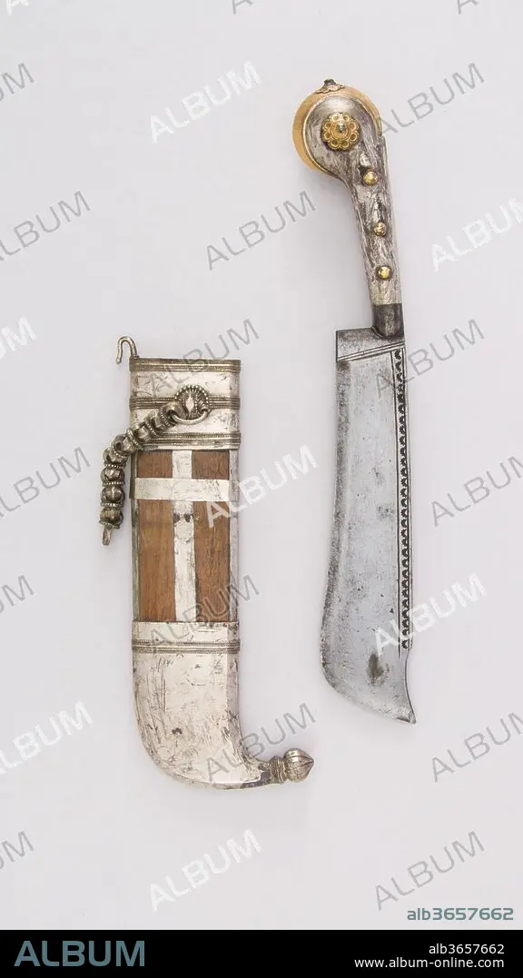 Caption: Knife (Pichangatti) with Sheath. Culture: Indian, Kodagu (Coorg). Dimensions: H. with sheath 12 13/16 in. (32.5 cm); H. without sheath 11 1/2 in. (29.2 cm); H. of blade 7 in. (17.8 cm); W. 1 7/8 in. (4.8 cm); Wt. 10.5 oz. (297.7 g); Wt. of sheath 5.6 oz. (158.8 g). Date: 18th-19th century.