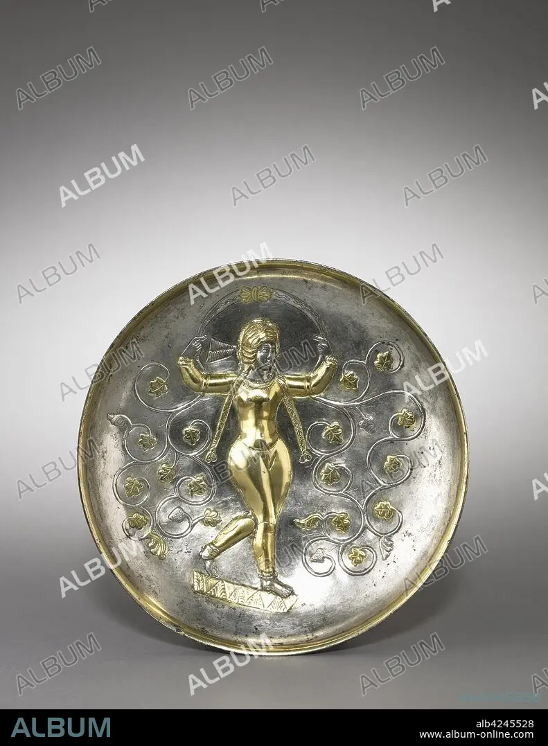 Caption: Dish: The Goddess Anahita, 400-600. Iran, Sasanian, 5th-6th Century. Silver gilt; overall: 4.6 x 21.6 cm (1 13/16 x 8 1/2 in.).