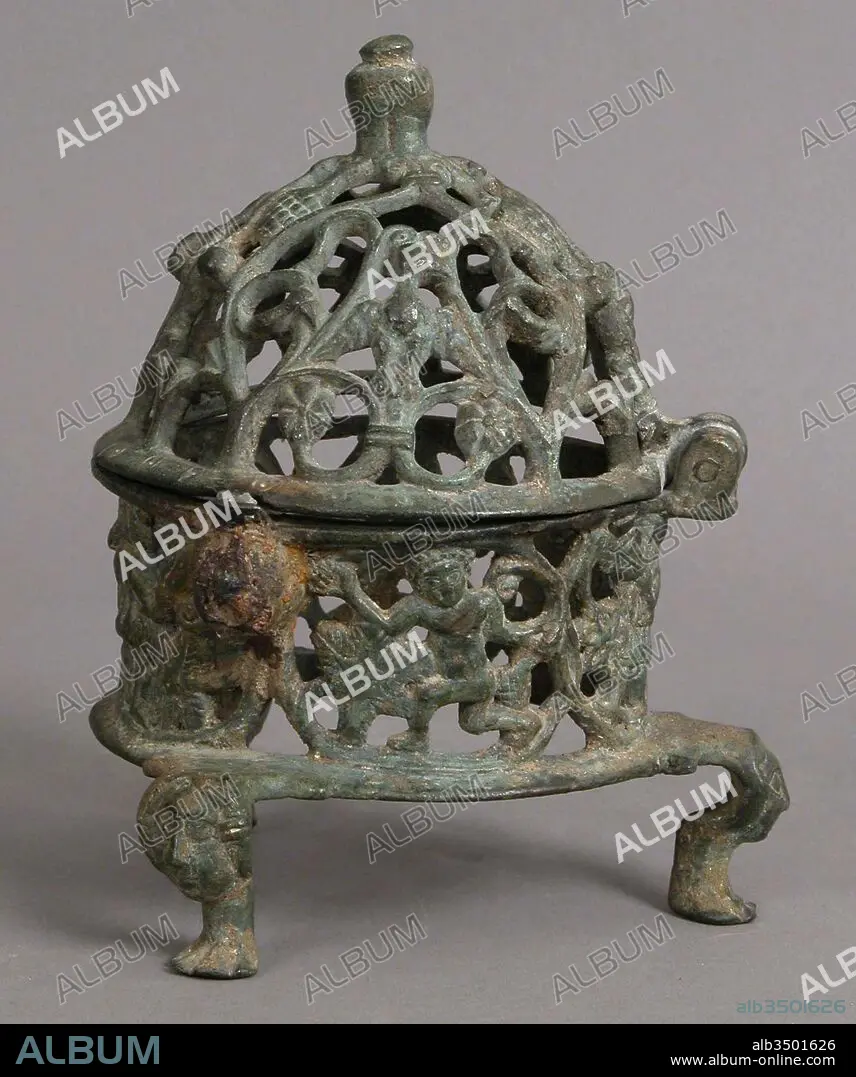 Caption: Censer Frame with Inhabited Vine Scroll, 6th century, Made in Syria, Byzantine, Copper alloy, Overall: 6 5/8 x 5 3/8 in. (16.8 x 13.7 cm), Metalwork-Copper alloy, The cavorting putti in the vine scroll represent the good life and may be associated with the retinue of Dionysos, the classical god of wine. Fragrant incense would have been burned on hot coals in the lost liner