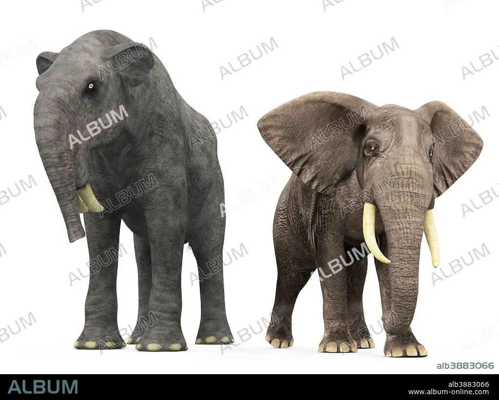 Title: An adult Deinotherium compared to a modern adult African Elephant.