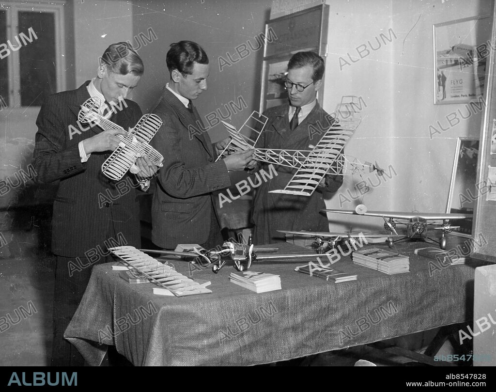 GÖTEBORG 1936-11-03.. Tre unga män med sina flygmodeller - de tillhör Modellflygklubb och vi ser dem i utställningslokalen hos Sjögrens järnaffär på Första Långgatan 4.. *** Local Caption *** GT Låda 1936-nov-01 Foto: Kamerareportage / TT / Kod: 2524