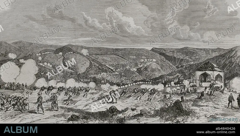 Caption: Austro-Hungarian campaign in Bosnia and Herzegovina (29 July to 20 October 1878). Bosnian uprising. Sarajevo. General attack by the Austro-Hungarian army, 19 August 1878. Engraving by Vela. La Ilustración Española y Americana (The Spanish and American Illustration), 1878.