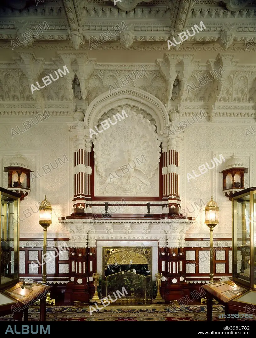 Caption: Osborne House, East Cowes, Isle of Wight, c1990-2010. View of the Durbar Room fireplace and peacock over the chimney-piece. A former royal residence in East Cowes, Isle of Wight, built between 1845 and 1851 for Queen Victoria and Prince Albert as a summer home and rural retreat. Designed in the style of an Italian Renaissance palazzo, built by Thomas Cubitt. Grade I listed and under the care of English Heritage.