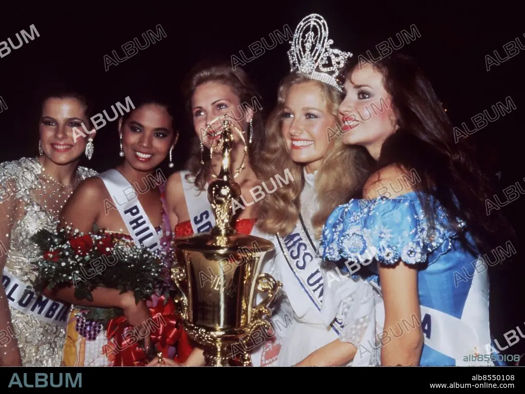©SCANPIX SWEDEN, 1984. Yvonne Ryding, Miss Universum 1984. Här ser vi Ryding (2:a fr.h.) i diadem med segertrofén i händerna, tillsammans med de andra tävlande skönheterna.. Foto: Scanpix. Code: 20360