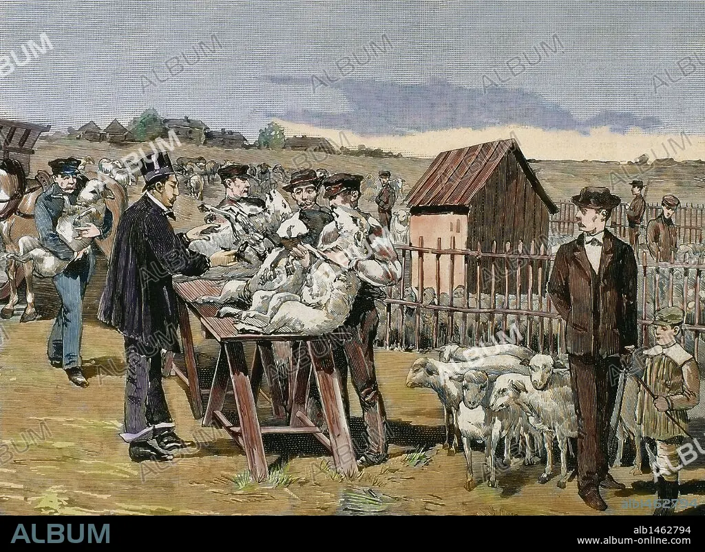 PASTEUR, Louis (1822-1895) French chemist and bacteriologist. Vaccination of sheep against anthrax. Agerville (France), 1884. Engraving.