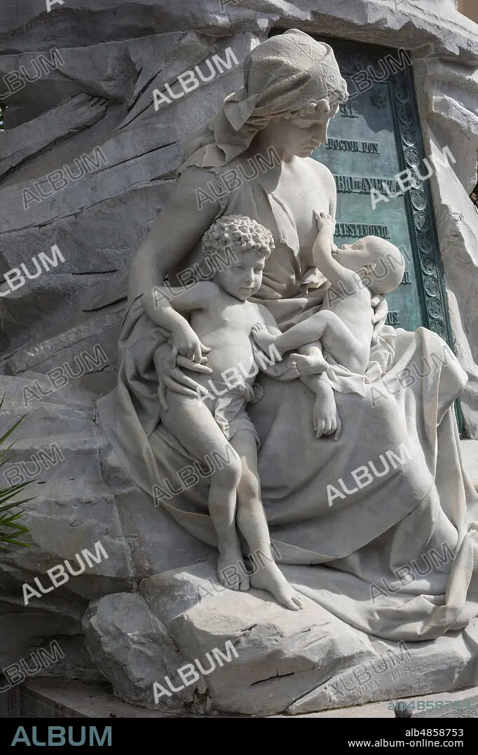 Escultura en mármol blanco de madre con dos hijos, amamantando a uno.