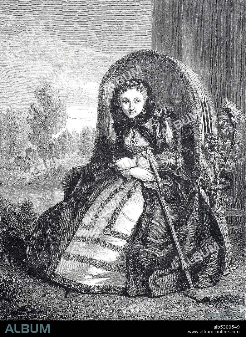 Digital improved reproduction, Young woman in disguise of an old woman in an armchair in the garden, France, original woodprint from th 19th century.