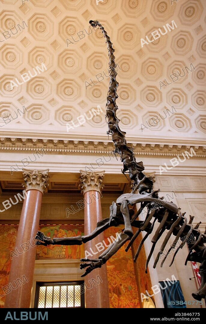 Barosaurus skeleton, American Museum of Natural History, New York. This skeleton depicts a mother rearing up on her hind legs to protect her offspring from predators. It is in the rotunda of the American Museum of Natural History, New York.