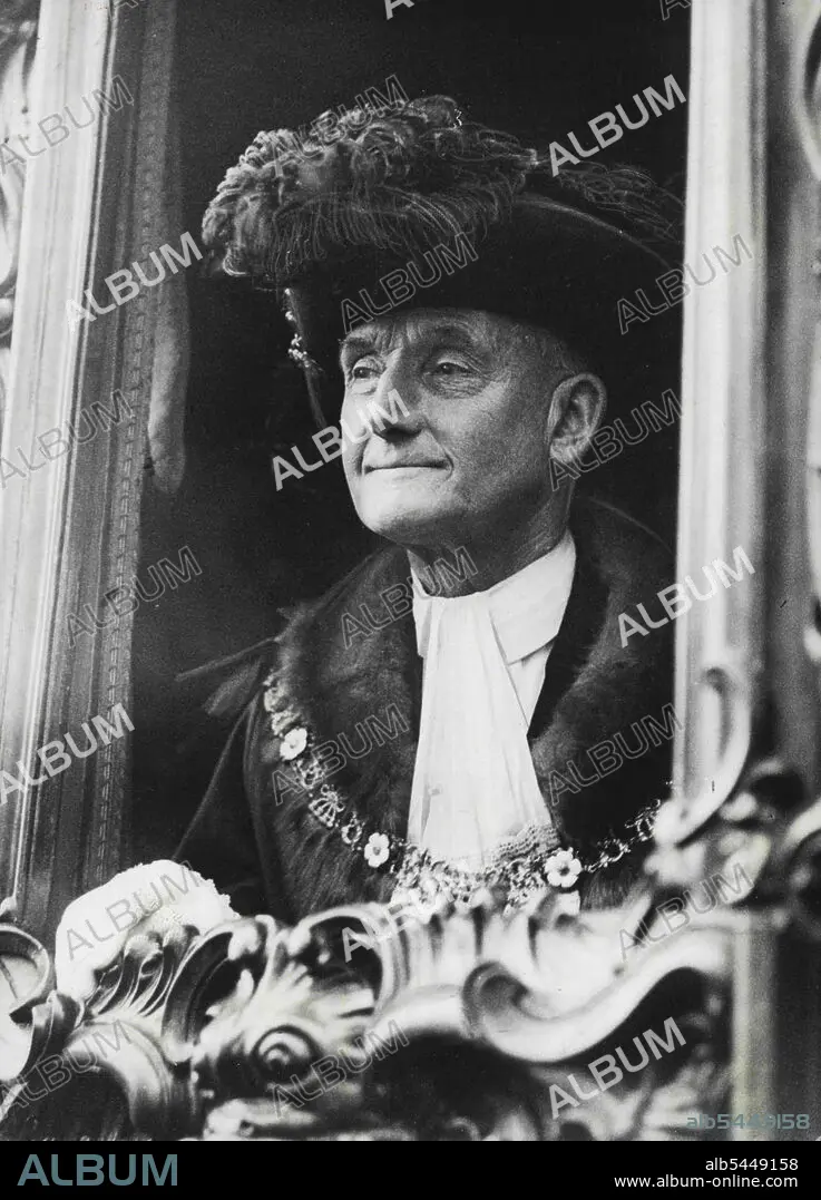 Caption: Sir George Broadbridge former lord mayor of London, smiles from his staff coach during the London lord *****. This year a semi-military procession. November 01, 1936. (Photo by Universal Pictorial Press Agency).