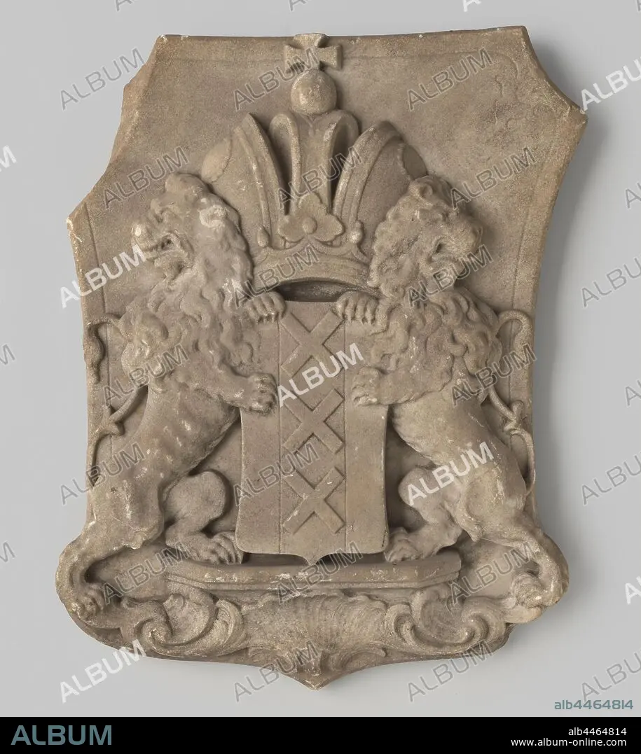 Coat of arms Amsterdam, Marble shield in which the crowned coat of arms of Amsterdam is worn by two climbing lions, anonymous, Netherlands, c. 1762, marble (rock), h 58.5 cm × w 44.0 cm × d 8.0 cm × w 33.0 kg.