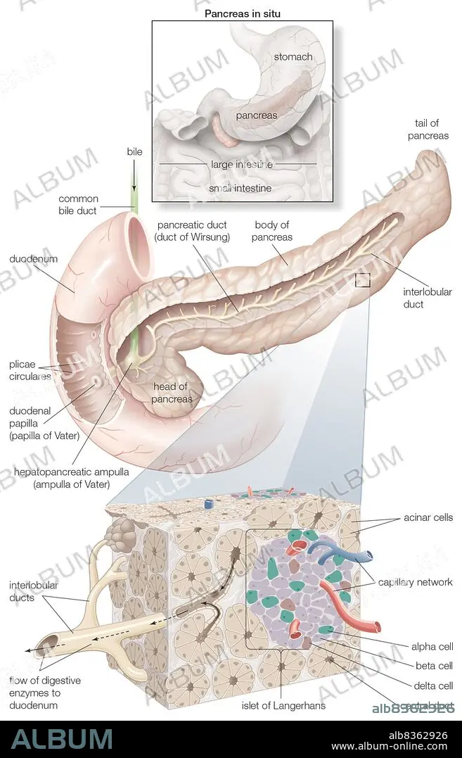Diagram detailing the parts of the pancreas, as well as an inset of its in situ position and an inset of histology