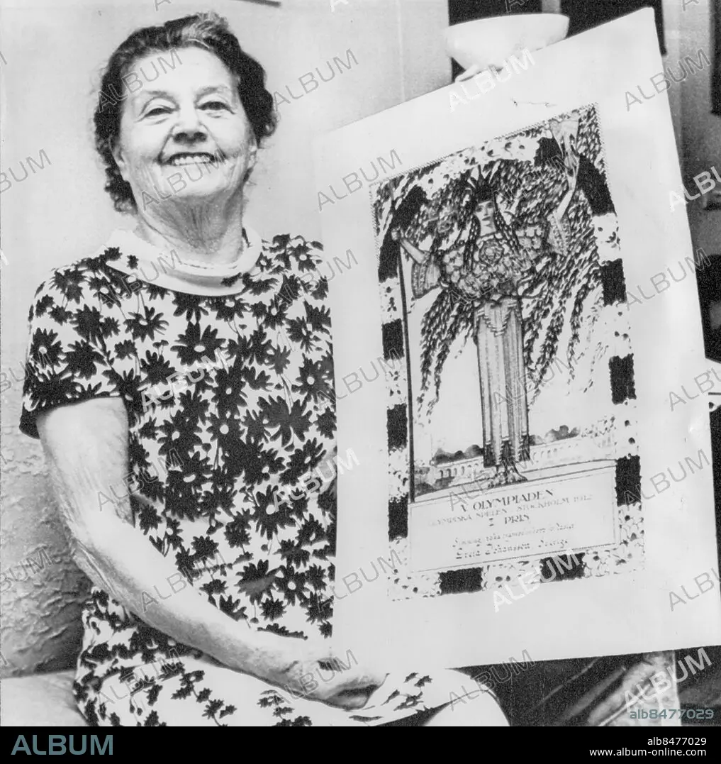 ARKIV MENLO PARK 1972-09-03. Simhopperskan Greta Johansson-Brandsten, Sveriges första kvinnliga olympiska guldmedaljör när hon vann i damernas höga raka trampolinhopp vid de olympiska sommarspelen i Stockholm 1912, sitter i hemmet i Menlo Park, Californen, USA, 3:e september 1972, och håller upp ett diplom från Stockholmsolympiaden 1912.. Foto: UPI / TT / Kod: 450
