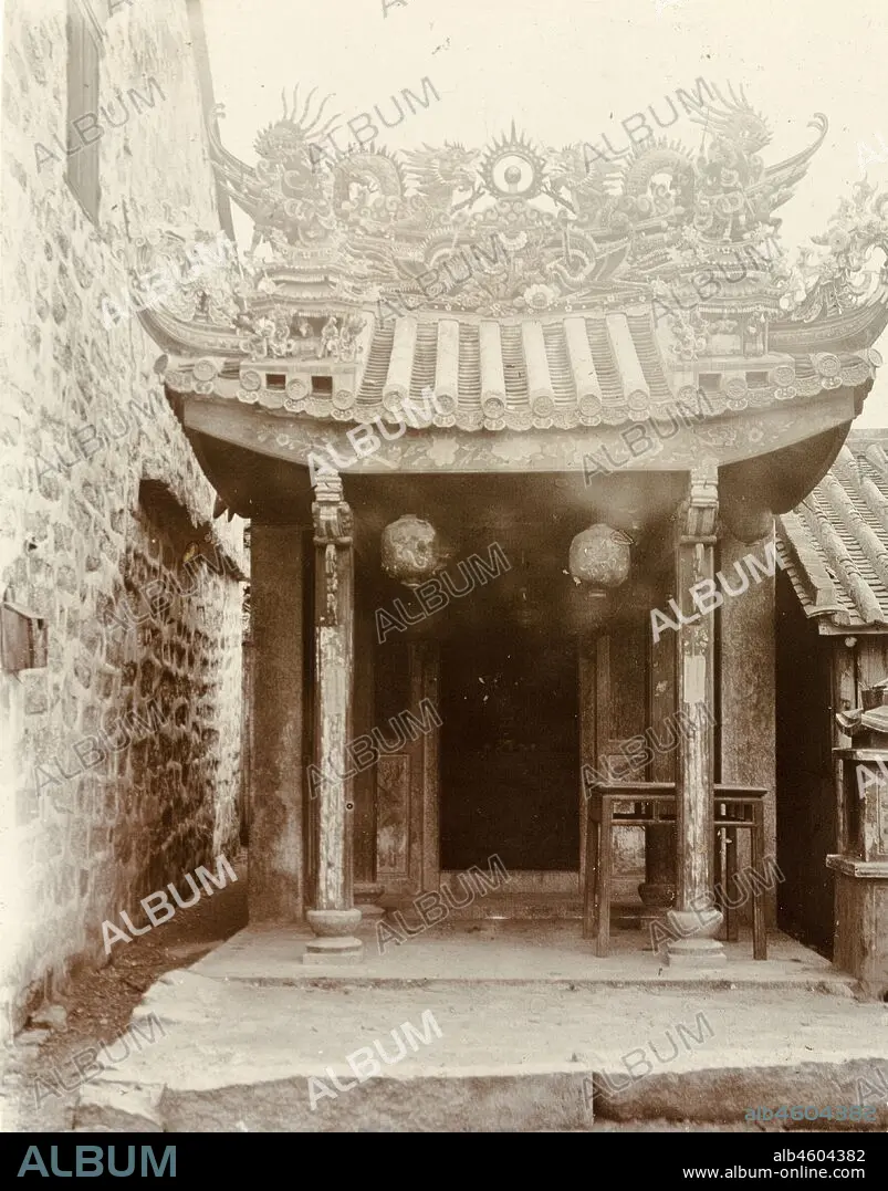 Caption: Hong KongChina, An ornate, pagoda-style roof, adorned with religious idols, decorates the doorway at the entrance to a 'Joss house'. Original manuscript caption: Joss House - specialty in roofs, circa 1903. 1998/028/1/1/48.