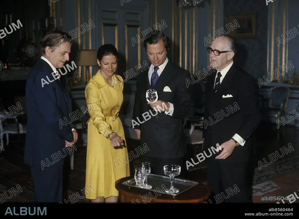 STOCKHOLM 1976-06-09. Statsminister Olof Palme, vänster och talman Henry Allard, höger överlämnar här svenska folkets lysningspresent till kung Carl XVI Gustaf och fröken Silvia Sommerlath (drottning Silvia) när de gifte sig 1976. De fick 800 glas med monogram.. Foto: Freddy Lindström / PrB / Scanpix Kod: 1047