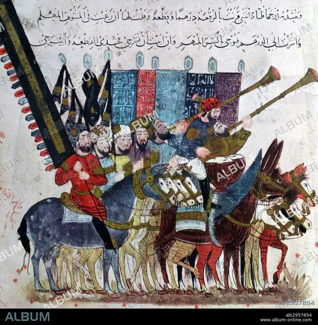 Caption: Procession at the end of Ramadan. Maqamat of al-Hariri, Bibliothèque nationale de France, manuscript Arabe 5847, 1237AD. Folio 19 Recto: maqama 07. Procession at the end of Ramadan. The Assemblies of al-Hariri recounts in the words of the narrator, al-Harith ibn Hammam and al-Hariri's several encounters with artist Abu Zayd al-Saruji