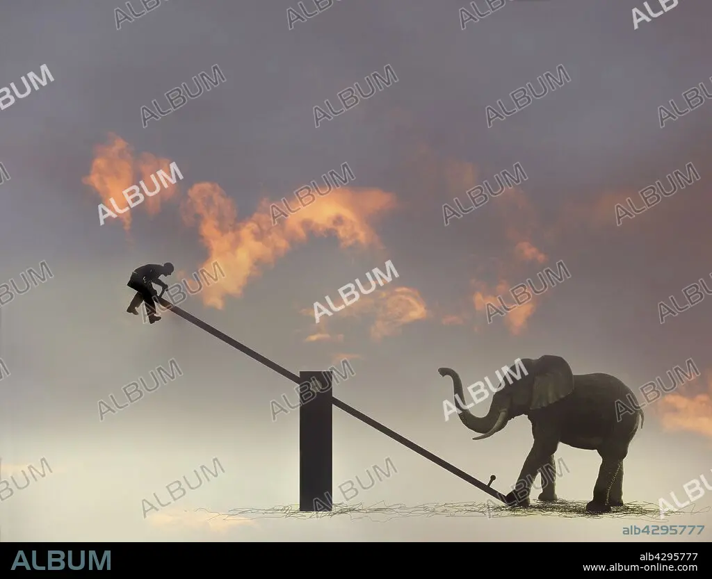 Man suspended in mid-air by elephant on seesaw
