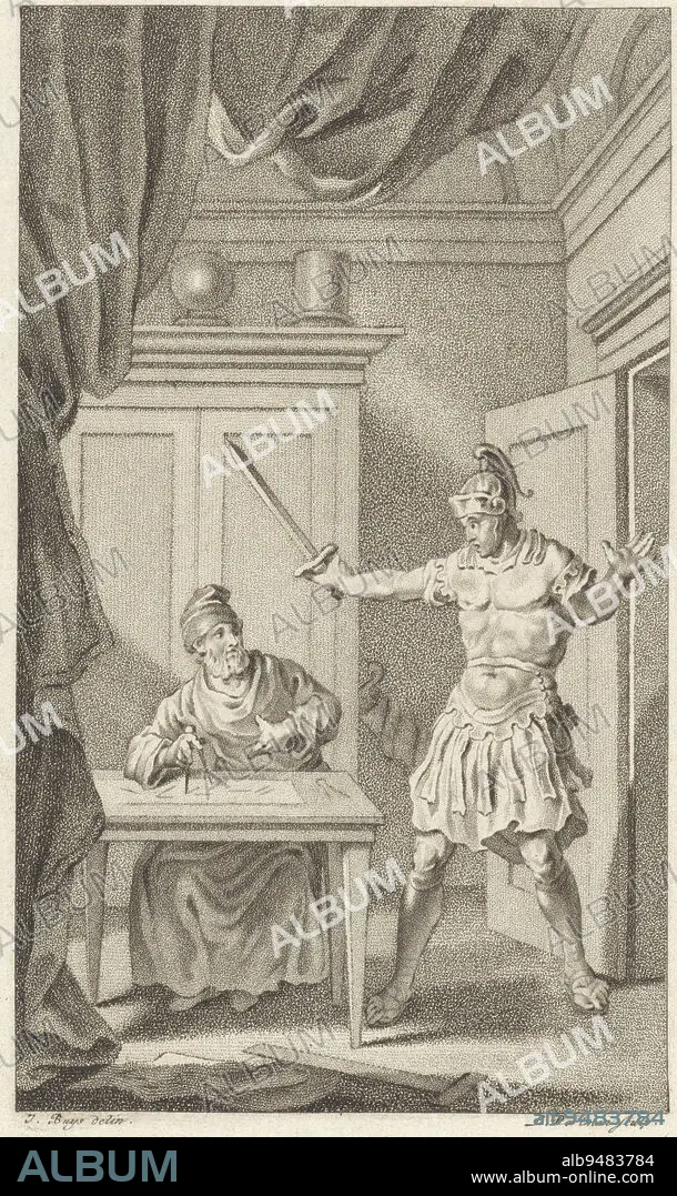 At the capture of Syracuse, Archimedes is killed by a Roman soldier. Archimes is sitting in his study room drawing a mathematical circle diagram. The Roman soldier who enters the room kills him with his sword. Death of Archimedes, print maker: Ludwig Gottlieb Portman, (mentioned on object), intermediary draughtsman: Jacobus Buys, (mentioned on object), Amsterdam, 1795, paper, h 215 mm × w 134 mm