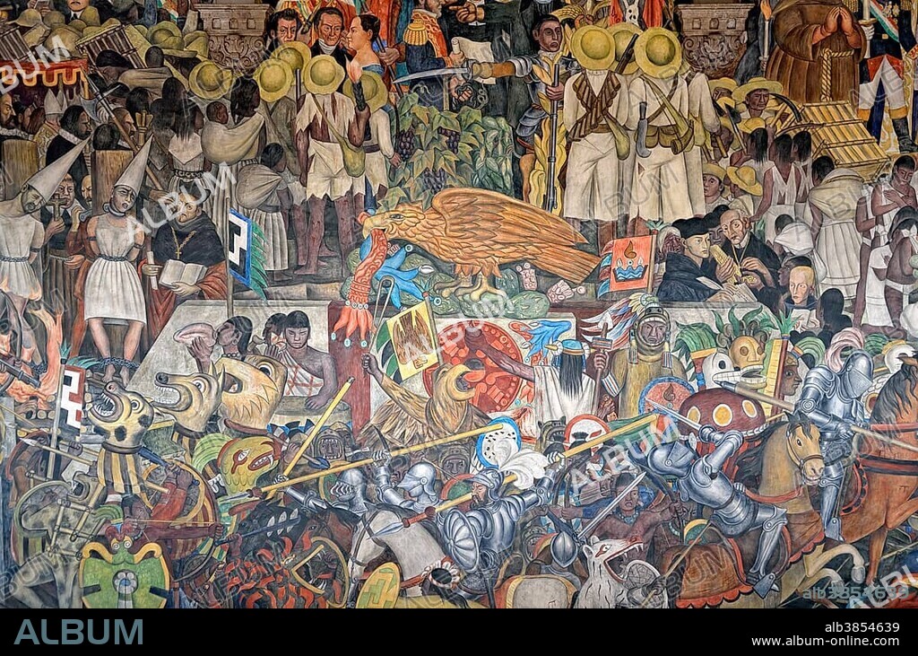 Caption: Fight scenes, colourful fresco painting by Diego Rivera on the history of Mexico, staircase of the Palacio Nacional, National Palace, Zoccalo, Mexico City, Mexico, Central America