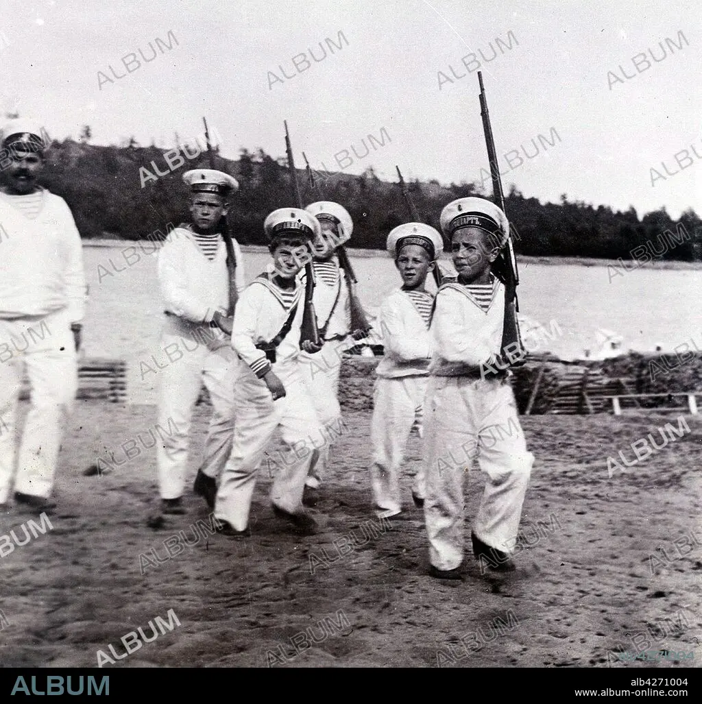 Caption: Klementy Nagorny (the sailor attendant) accompanies Alexei the Tsarevich (4th from right) as he plays with friends. Alexei Nikolaevich (1904 – 17 July 1918) the Tsarevich of the Russian Empire. He was the youngest child and only son of Emperor Nicholas II and Empress Alexandra Feodorovna. He was born with haemophilia, his mother's reliance on the faith healer Grigori Rasputin to treat the disease helped bring about the end of the Romanov dynasty.