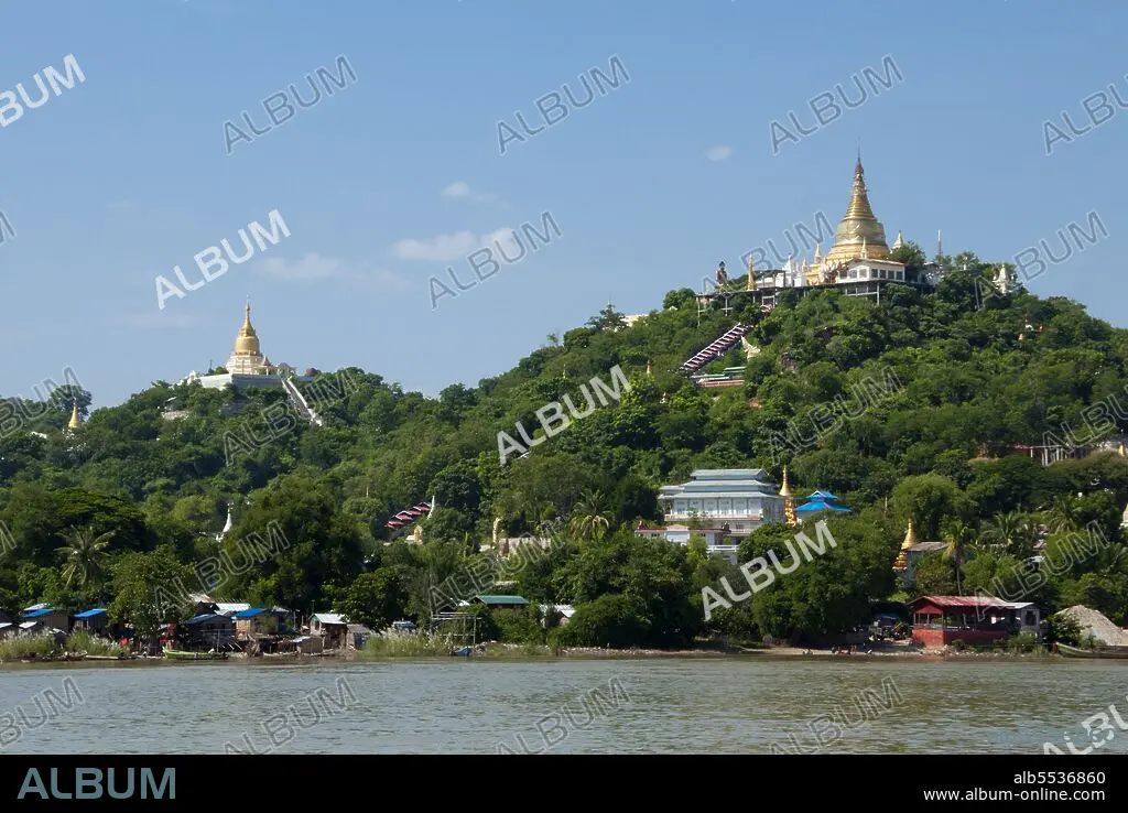 Title: Burma / Myanmar: Pagodas at Sagaing seen from the Irrawaddy / Ayeyarwady River, near Mandalay