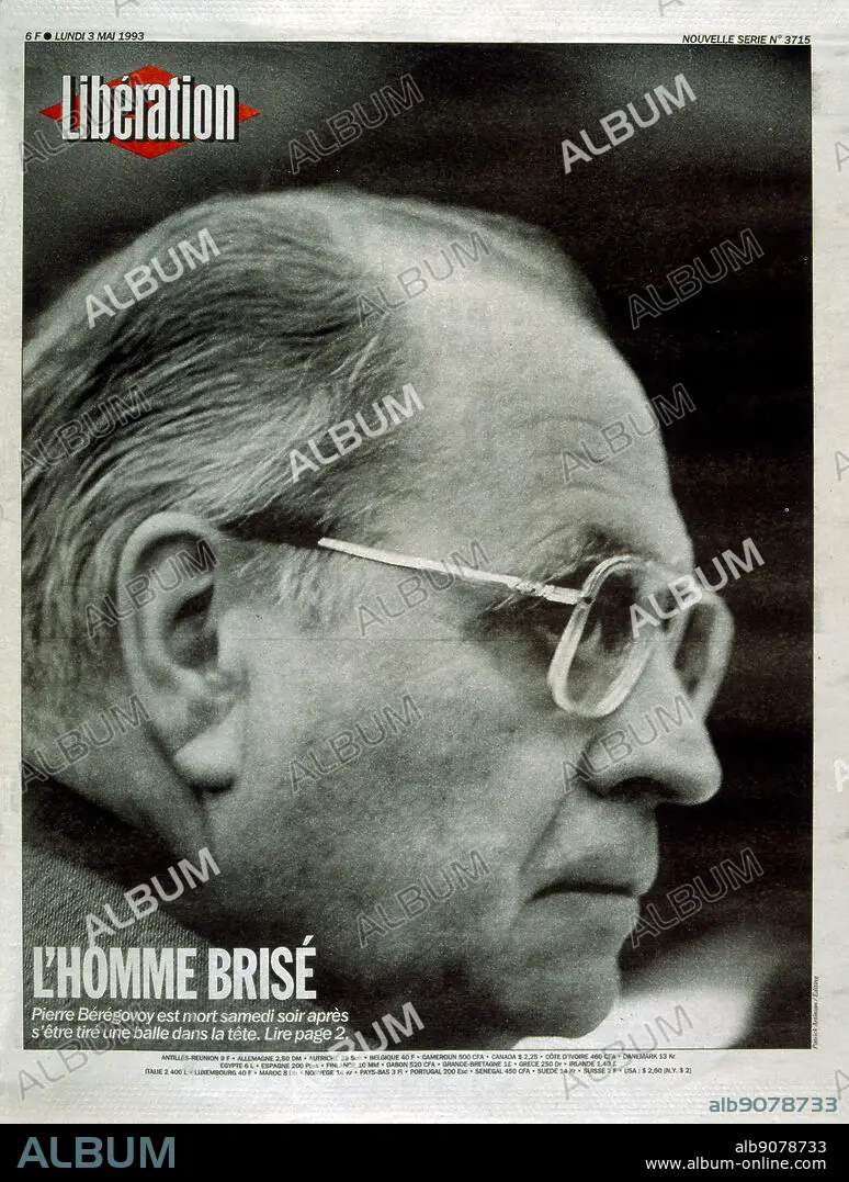Caption: Cover of the French publication 'Liberation' after the suicide of Pierre Beregovoy, May 1993. Pierre Eugene Beregovoy (1925 - 1 May 1993) was a French politician who served as Prime Minister of France under President Francois Mitterrand from 2 April 1992 to 29 March 1993. He committed suicide. His successor as Prime Minister, Edouard Balladur, is seen leaving the funeral in Nevers.