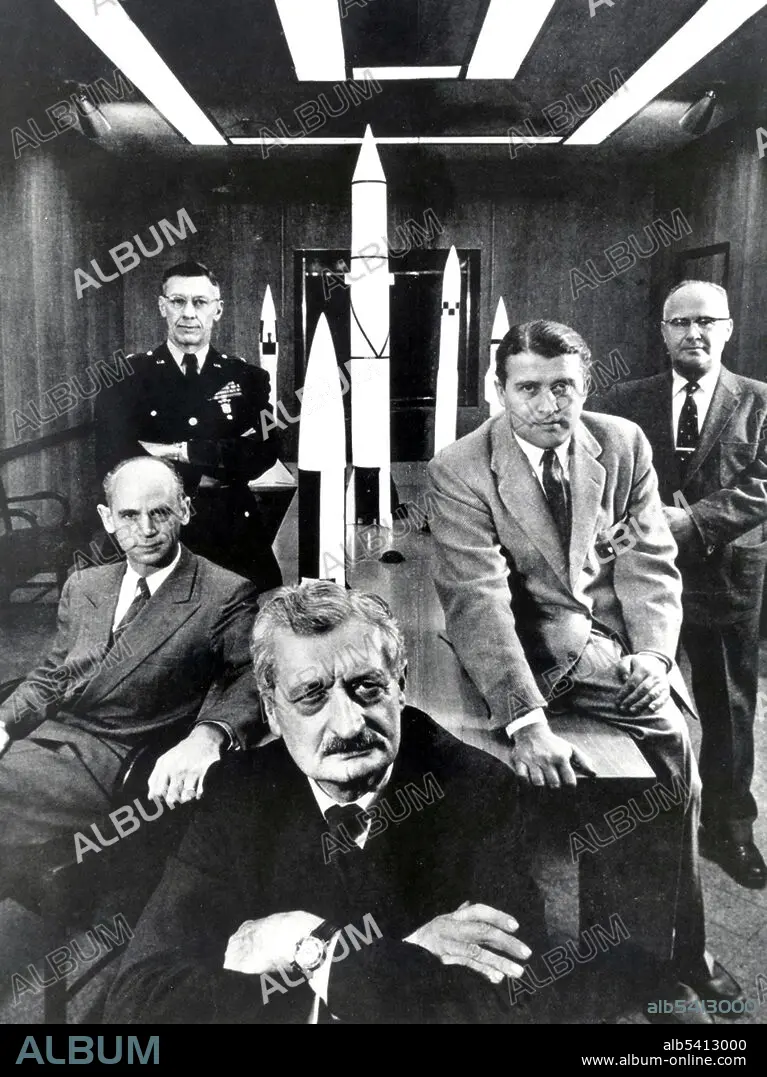 Caption: Hermann Oberth (forefront) with officials of the Army Ballistic Missile Agency at Huntsville, Alabama in 1956. Left to right: Dr. Ernst Stuhlinger (seated); Major General H.N. Toftoy, Commanding Officer and person responsible for Operation Paperclip, which took scientists and engineers out of Germany after WWII to design rockets for American military use. Many of the scientists later helped to design the Saturn V rocket that took the Apollo 11 astronauts to the Moon. Dr. Eberhard Rees, Deputy Director, Development Operations Division Wernher von Braun, Director, Development Operations Division.