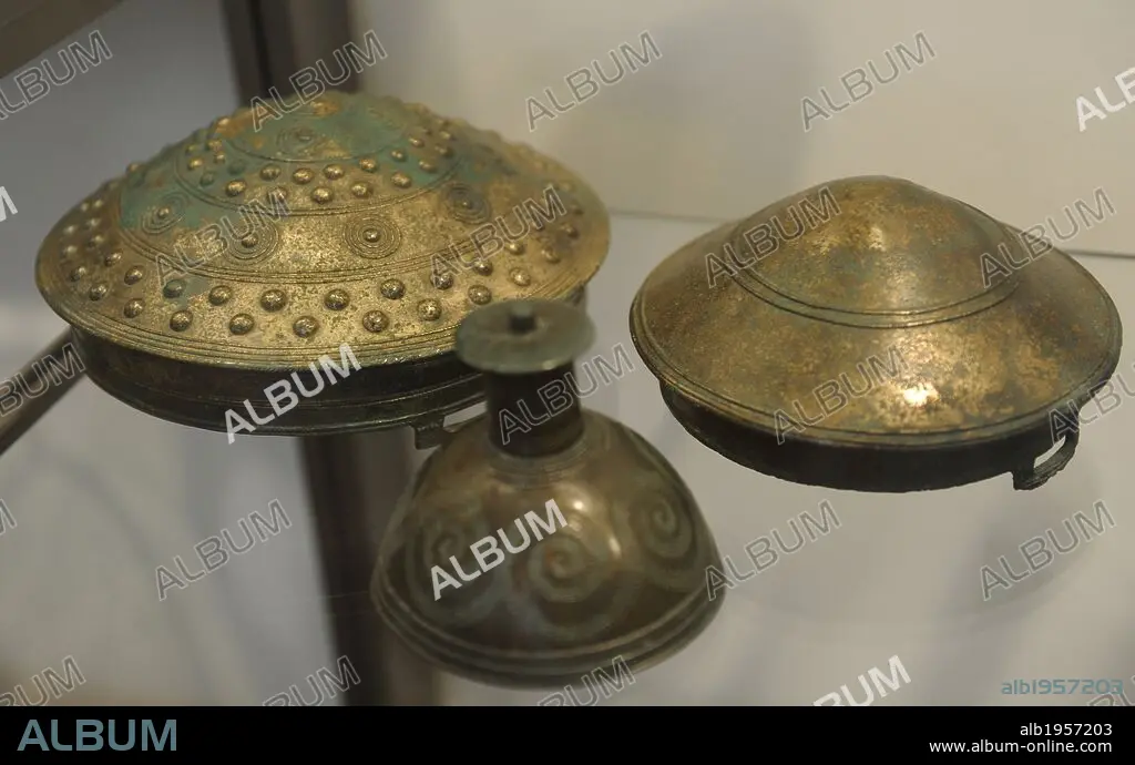 Caption: Prehistory. Art. Metal Age. Bronze Age. Belt ornaments, arm rings, a neck ring. from a gravel hill at Fardal, central Jutland. 900-700 BC. National Museum of Denmark.