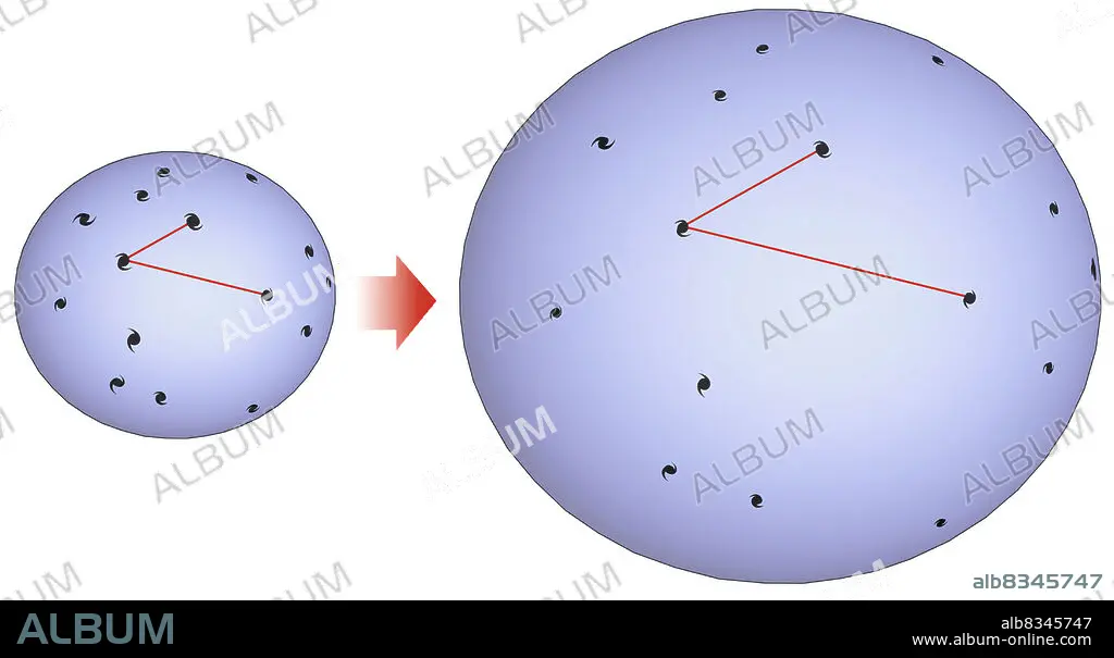 Caption: Hubble observed that galaxies move away from each other more rapidly the more distant they are. In 1929, he formulated a law that states that the speed at which galaxies move apart increases as a function of distance. A simple analogy shows how this phenomenon works: imagine a sphere containing galaxies.