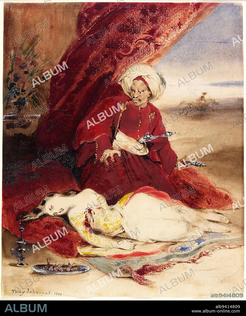 Caption: Leila, Hassan and the Giaour, 1829, Tony Johannot, French, 1803 - 1852, 8 1/4 x 6 13/16 in. (20.96 x 17.3 cm), Watercolor with gum arabic and heightening, France, 19th century