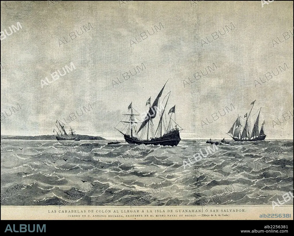 Automatic translation: COLUMBUS, CRISTOBAL. GENOVESE NAVIGATOR. 1451 - 1506. "THE CARABELS OF COLUMBUS WHEN THEY ARRIVED AT THE ISLAND OF GUARANI OR SAN SALVADOR". ENGRAVING OF THE SPANISH AND AMERICAN ILLUSTRATION