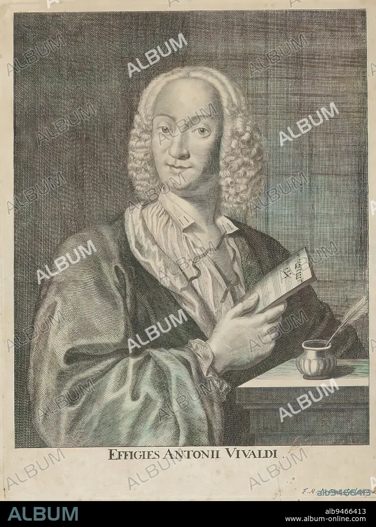 Caption: Portrait of Italian composer Antonio Vivaldi, Effigies Antonii Vivaldi (title on object), print maker: François Morellon La Cave, (mentioned on object), Amsterdam, 1725, paper, engraving, height 245 mm × width 186 mm, height 302 mm × width 230 mm