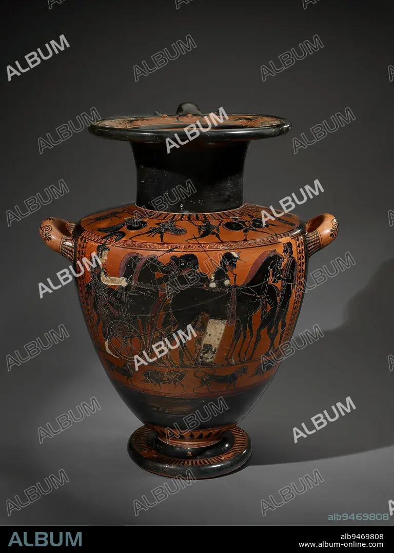 Caption: Black-figured Hydria, c. 530 BCE, Attributed to the Antimenes Painter, Greek, (Attica), 20 3/4 x 17 x 15 in. (52.71 x 43.18 x 38.1 cm), Slip-glazed earthenware, Greece, 6th5th century BCE, The Antimenes Painter decorated many hydriae--three-handled water jars--of the sort seen here. In the main scene the goddess Athena, painted white to indicate her gender, helps harness her four-horse chariot, assisted by several grooms and the bearded charioteer. This harnessing technique accurately reflects sixth-century b.c. practices. The appearance of Athena dressed for war may refer to her legendary invention of the war chariot or perhaps to an episode from the Iliad.The scene on the shoulder of the vase depicts Zeus, the central figure, intervening in the fight between Heracles (on Zeus' right) and Cycnus (on his left). This divine battle occurred because Cycnus stole the sacrificial animals of the god Apollo.