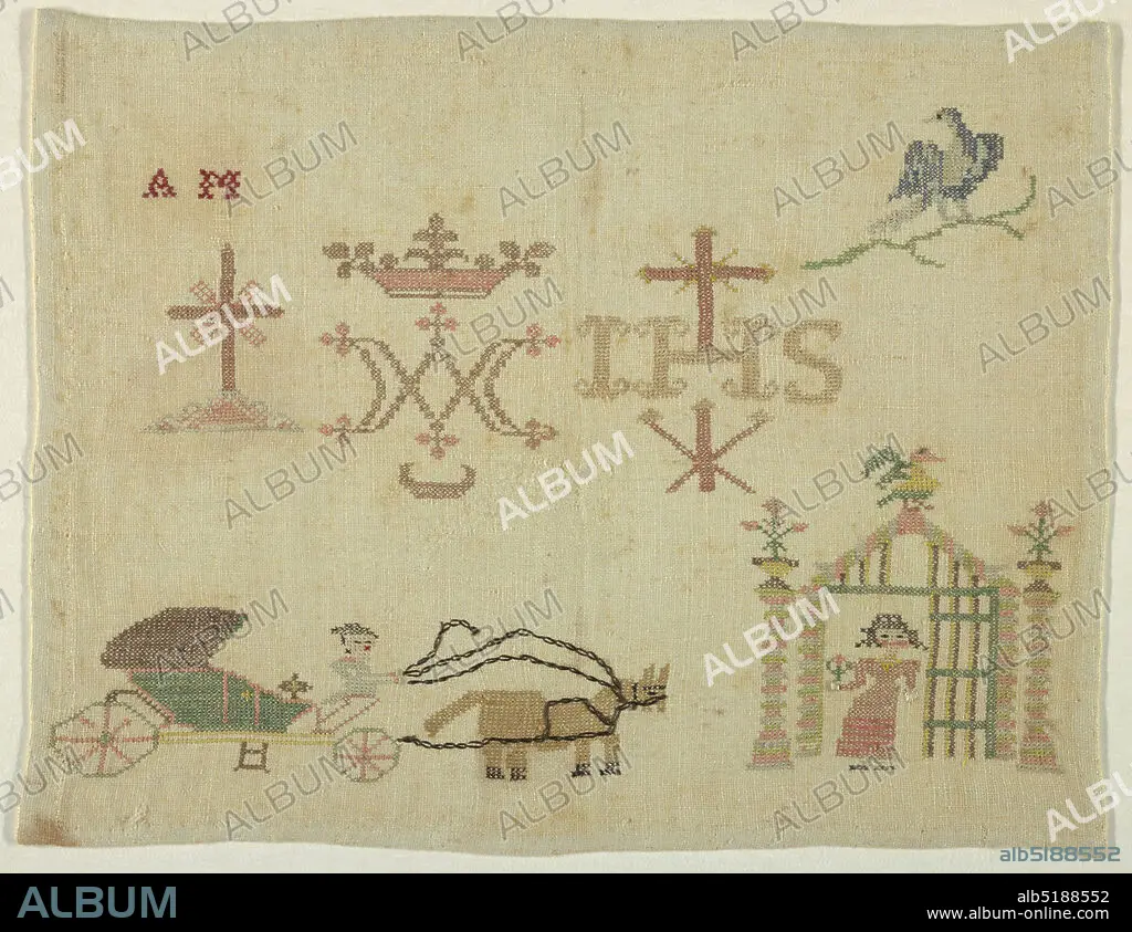 Sampler, Medium: silk embroidery, cotton foundation Technique: cross stitch on plain weave, Detached motifs including the Holy monogram, a bird on a branch, a woman standing at a gate, a carriage with horse and drivers and the initials 'A.M.', Germany, early 19th century, embroidery & stitching, Sampler