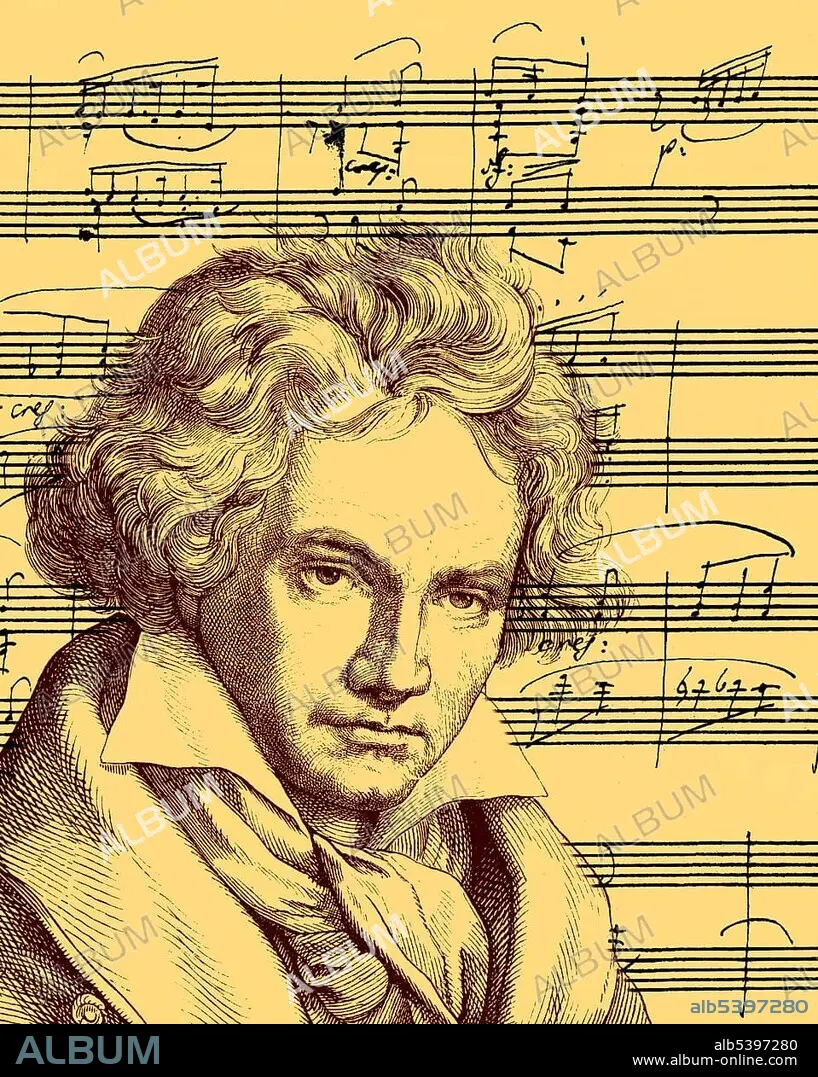 Caption: Historical drawing from the 19th Century, manuscript, handwritten sheet music, A flat major Sonata Op. 26, portrait of Ludwig van Beethoven, 1770-1827, German composer of the Classical Period