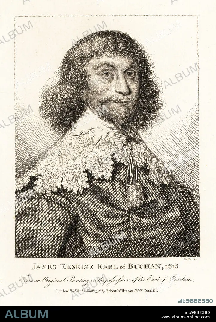 Caption: James Erskine, 6th Earl of Buchan, courtier, 1615. With long hair, Van Dyke beard, broad lace collar over doublet. Eldest son of John Erskine, Earl of Mar, and Marie Stewart, daughter of the Duke of Lennox. Died 1640. From an original painting in the possession of the Earl of Buchan. Copperplate engraving by Thomas Trotter from John Smiths Iconographia Scotica, or portraits of illustrious persons of Scotland, Robert Wilkinson, 58 Cornhill, London, 1798.