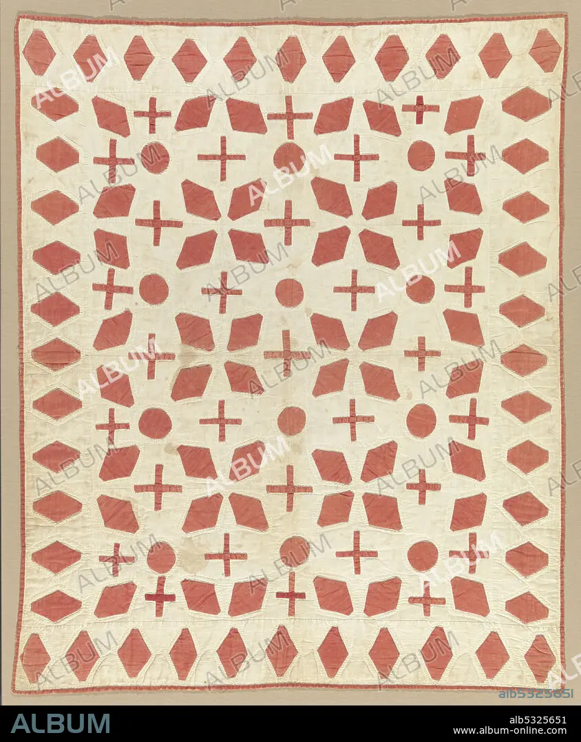 A cream and red appliqued quilted bedcover made from plain cotton fabrics. The top consists of twelve (12) blocks sewn together by hand and decorated with a geometric design using turned hand applique. Each block contains a circle in the center surrounded by four (4) diamonds that have blunt long tips. Crosses are appliqued over the center of the seams that join the blocks, with additional crosses in the spaces between the diamonds around the outer edge. The blocks are bordered by a panel of the repeating blunt-tipped diamonds around all sides. The quilt is bound with the red fabric by hand. A layer of cotton batting is placed between the top and the backing fabric. The top, batting, and backing are joined with quilted stitches in cream thread that surround each applique shape in two rows.