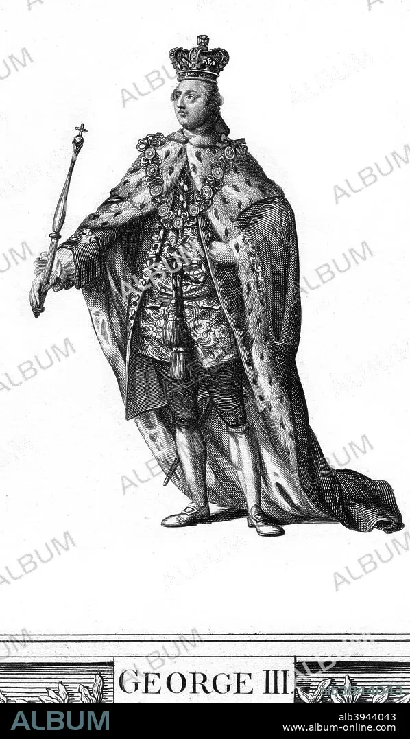 Caption: George III of the United Kingdom. Portrait of King George III, (Mad King George, 1738-1820), who ruled Britain from 1760 until his son (the future King George IV) became Regent in 1811.