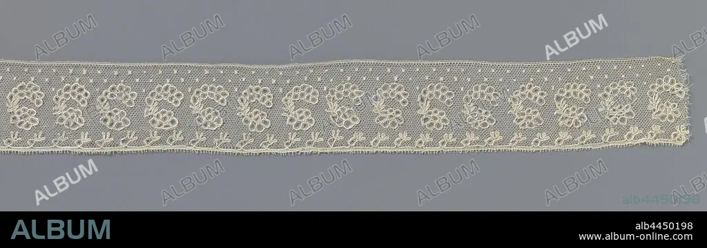 Caption: Strip of bobbin lace with c-shaped motif made with circles, Strip of natural-colored bobbin lace: Lille lace. Scattering pattern of square ribbons with, below, on the center line, a repeating pattern of a one-sidedly oriented c-shaped motif of openwork circles or so-called 'pins'. Along the underside of the strip are circles or berries, crowned with three narrow leaves. All circles are made with thicker and shiny contour threads, along which a decorative soil has been applied. Hardly any full work has been applied, only the three narrow leaves of the berries and a few narrow leaves in the c-shaped motif are made in linen. The top and bottom of the strip are finished straight, with the bottom provided with picots., anonymous, Belgium, c. 1830 - c. 1850, linen (material), Lille lace, l 190 cm × w 5.2 cm ×, 2.5 cm