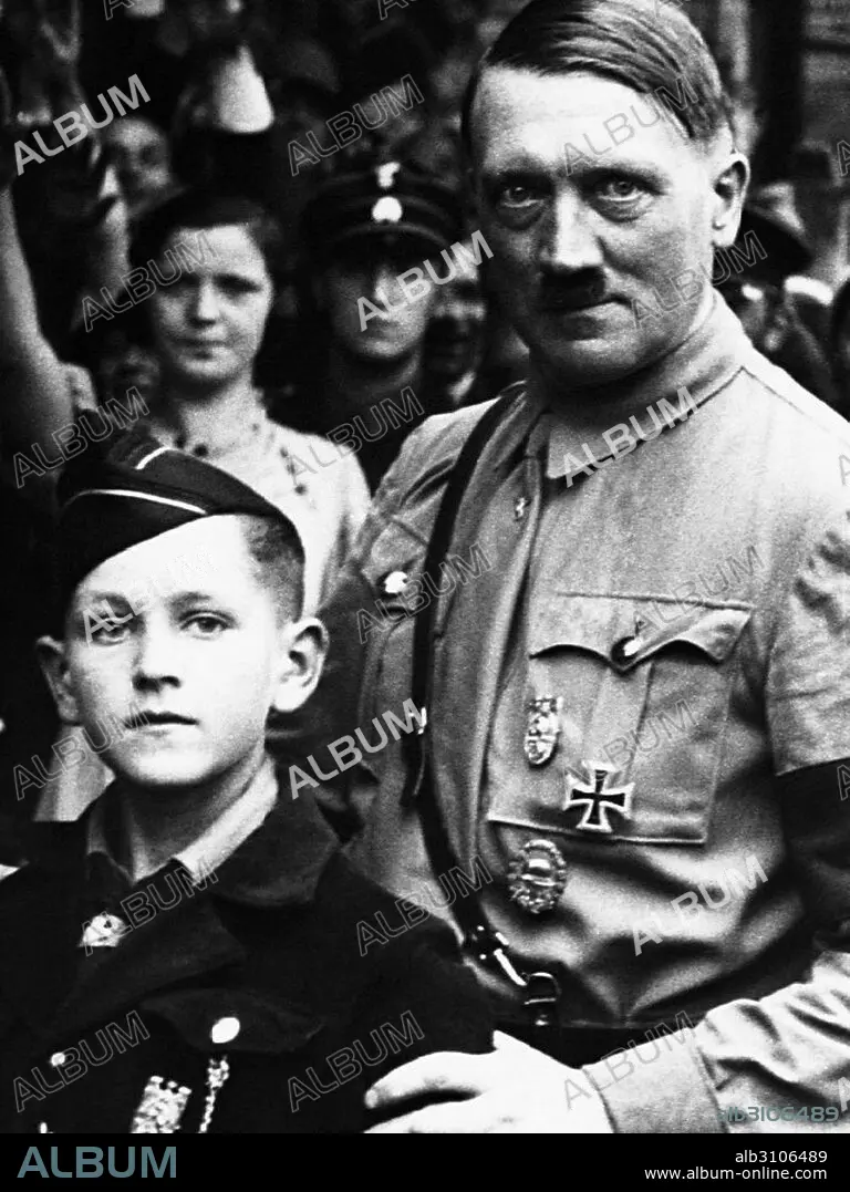Adolf Hitler 1889-1945, German Nazi leader, seen standing with a young Hitler Youth Member 1934.