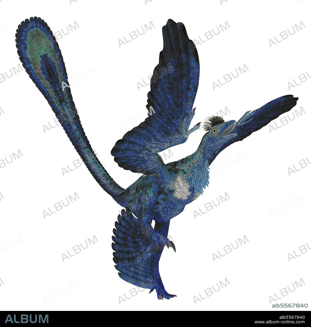 Caption: Microraptor reptile, side view on white background. Microraptor was a carnivorous four-winged reptile bird that lived in Mongolia, China during the Cretaceous Period.