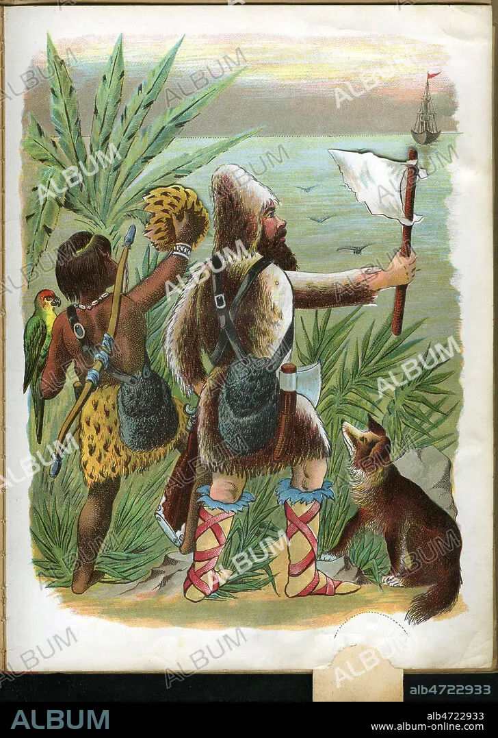 Robinson Crusoe et Vendredi appelant le navire salvateur. Illustration anonyme pour un livra a systeme d'apres le roman de de Daniel DEFOE (1660-1731). Credit : Collection Jean Vigne/KHARBINE-TAPABOR.