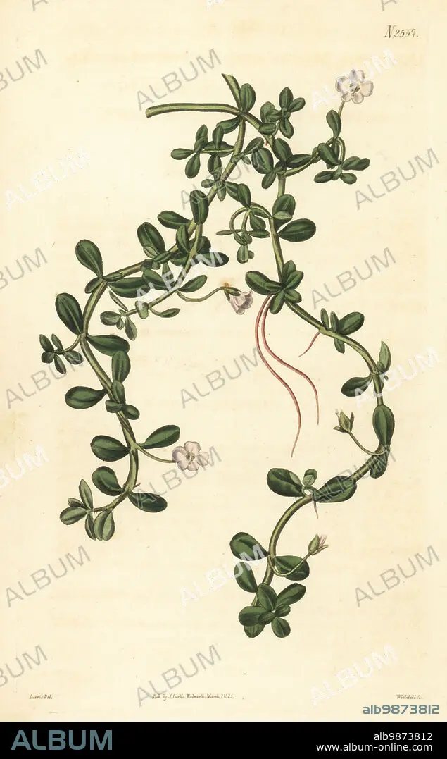 Caption: Brahmi or waterhyssop, Bacopa monnieri. Purslane-leaved herspestis, Herpestis monnieria portulacacea. Handcoloured copperplate engraving by Weddell after a botanical illustration by John Curtis from William Curtis's Botanical Magazine, Samuel Curtis, London, 1825.