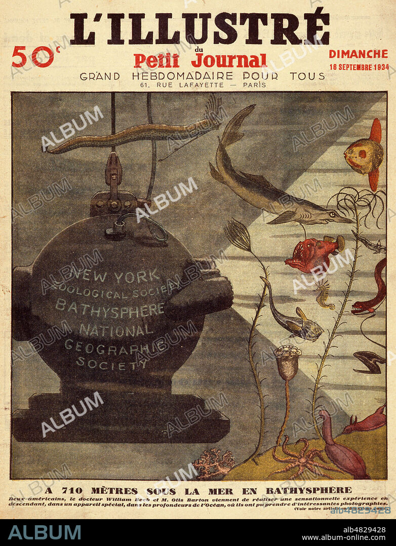 'A 710 metres sous la mer en bathysphere'. (Plongee de William BEEBE (1877-1962) et Otis BARTON (1899-1992) pour la National Geographic Society). Couverture de L'Illustre du Petit Journal du 16 septembre 1934. Credit : Collection Jonas/KHARBINE-TAPABOR.