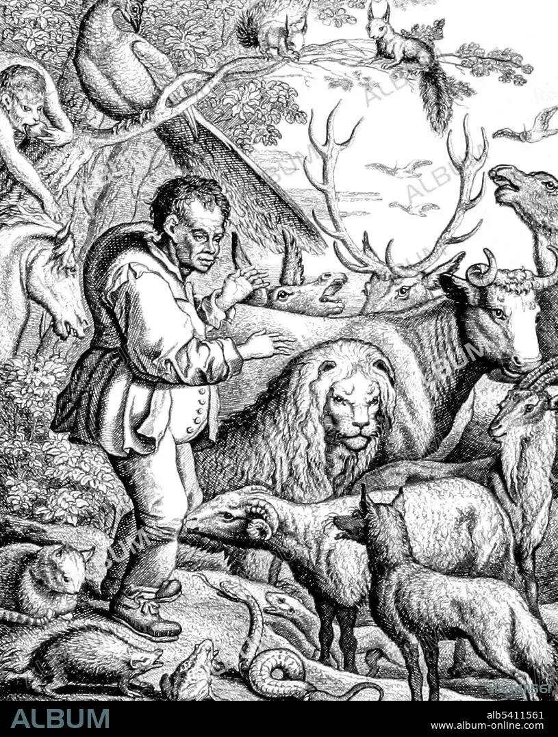 Caption: Aesop (620 - 564 BC) was a Greek fabulist and storyteller. Aesop's Fables is a collection of fables credited to him. Of diverse origins, the stories associated with his name have descended to modern times through a number of sources and continue to be reinterpreted in different verbal registers and in popular as well as artistic media. Many of the tales are characterized by animals and inanimate objects that speak, solve problems, and have human characteristics. Some scholars believe Aesop was Ethiopian supported by the presence of camels, elephants and apes in the fables. Woodcut (cropped and converted to bw) by Francis Barlow, from The Fables of Aesop translated by John Ogilvy, circa 1666.