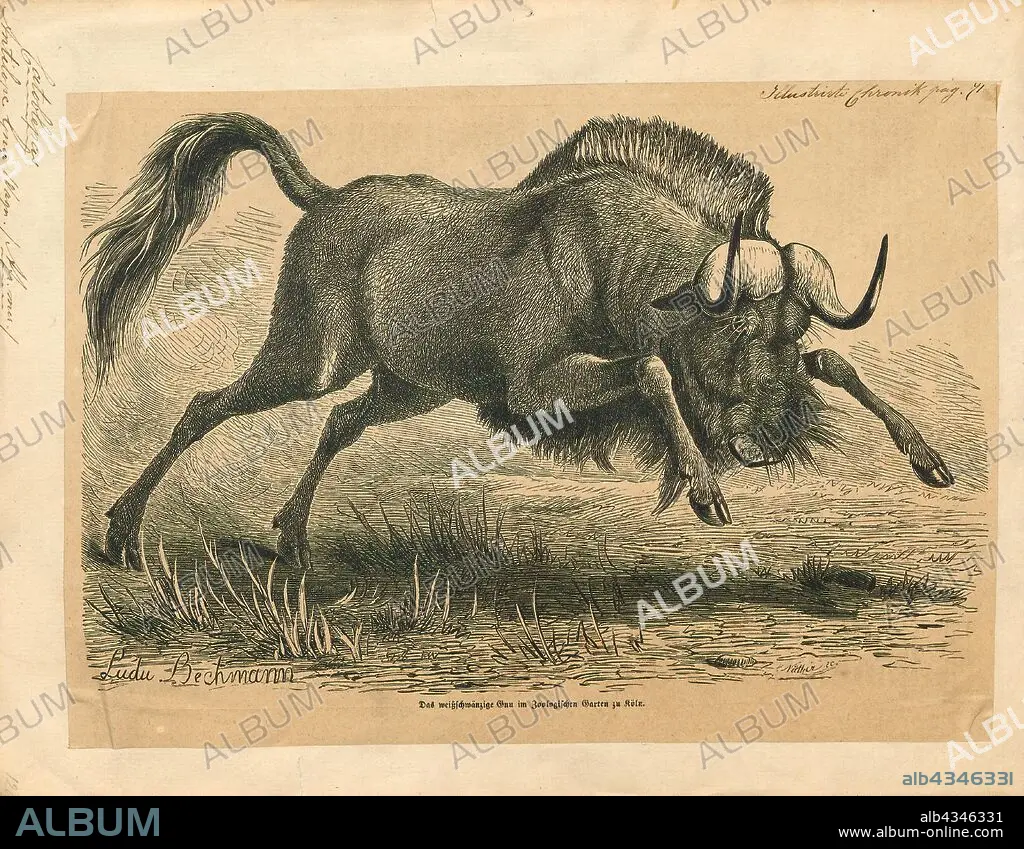 Caption: Antilope gnu, Print, The black wildebeest or white-tailed gnu (Connochaetes gnou) is one of the two closely related wildebeest species. It is a member of the genus Connochaetes and family Bovidae. It was first described in 1780 by Eberhard August Wilhelm von Zimmermann. The black wildebeest is typically 170–220 cm (67–87 in) in head-and-body length, and the typical weight is 110–180 kg (240–400 lb). Males stand about 111–121 cm (44–48 in) at the shoulder, while the height of the females is 106–116 cm (42–46 in). The black wildebeest is characterised by its white, long, horse-like tail. It also has a dark brown to black coat and long, dark-coloured hair between its forelegs and under its belly., 1700-1880