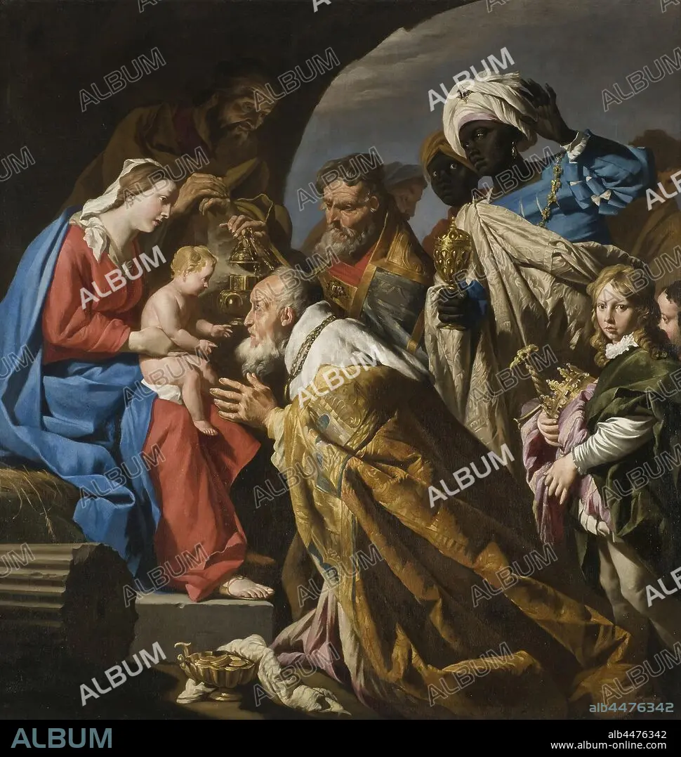 Caption: Matthias Stom, The Adoration of the Magi, Adoration of the Kings, painting, religious art, early 1630s, oil on canvas, Height, 175 cm (68.8 inches), Width, 172 cm (67.7 inches)