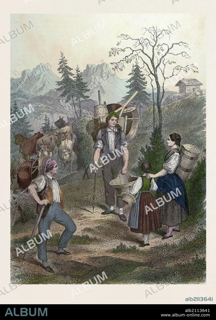 Caption: Countrylife 1857, man, woman, cows, farm, food and drink, basket, dishes, folk dress, 19th century, liszt gourmet archive